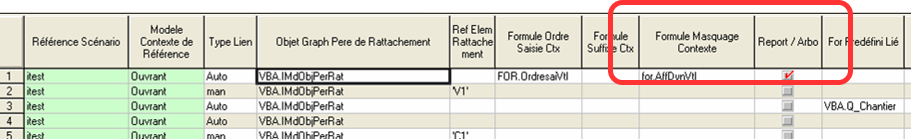 Formule Masquage CTX | Formule permettant de définir pour chacun des contextes fils à créer le fait qu’il soit masqué ou pas. La formule est exécutée pour chaque contexte fils, elle doit renvoyer YES pour que le contexte soit masqué, sinon le contexte est affiché. Les VBP suivantes sont utilisables en entrée de matrice : IScModCtxFils , IScNbCtxFilsFor , IScIndCtxFilsEC , IScIndCreFilsModExi , IScCtxFilsModExi , IScCtxFilsModExi , IScIndCreFilsTsMod et IScRefCtxFils. |