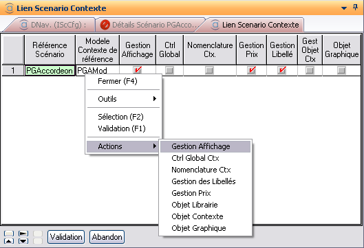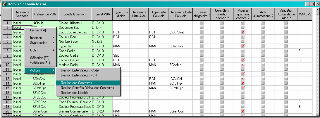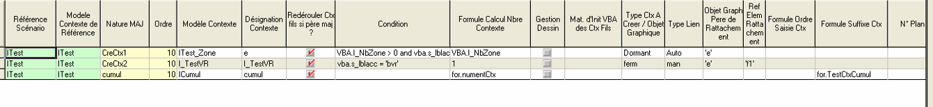 L’action « Gestion des Contextes » permet de lancer le tableur « Lien Scénario Contexte » suivant, récapitulant les différents points de paramétrage liés à la gestion contexte du scénario :