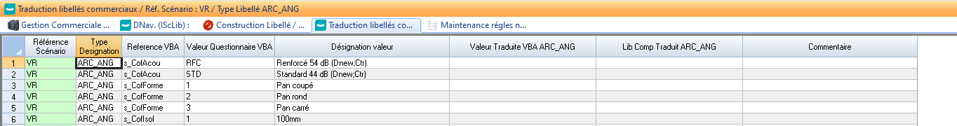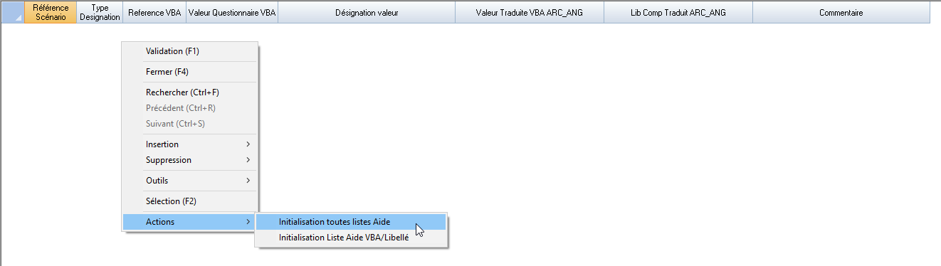 L’action « Traduction Libellé » permet d’accéder à un tableur où seront stockées les traductions des valeurs et désignations reprises directement des listes d’aide du scénario.