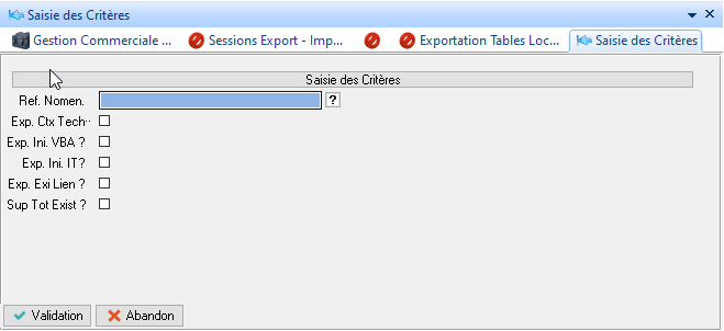 En cliquant sur le bouton « critères », on accèdera à une nouvelle fenêtre qui permet de déterminer quelle nomenclature sera exportée ainsi que les différents éléments de paramétrage qu’on exportera. Cette étape est à répéter autant de fois qu’il y a de nomenclatures à exporter, en changeant à chaque fois le nom du fichier d’export.