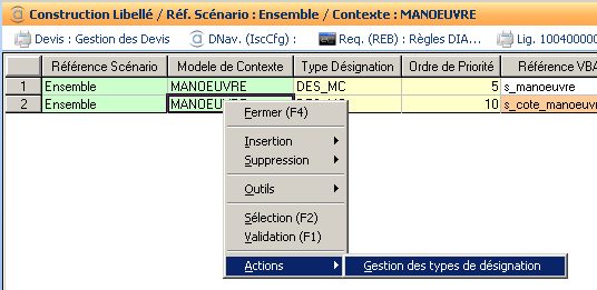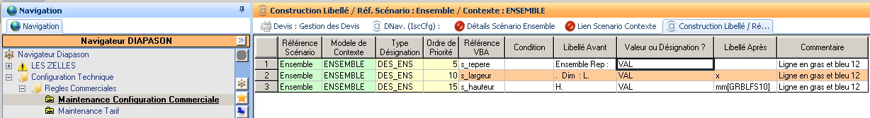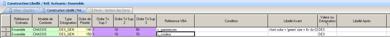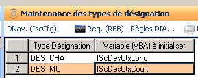Dans cet exemple, il est prévu d’alimenter deux variables ‘standard’ du moteur de configuration (VBA.IScDesCtxLong & VBA.IScDesCtxCourt) pour une désignation Chantier et une désignation Diffus.