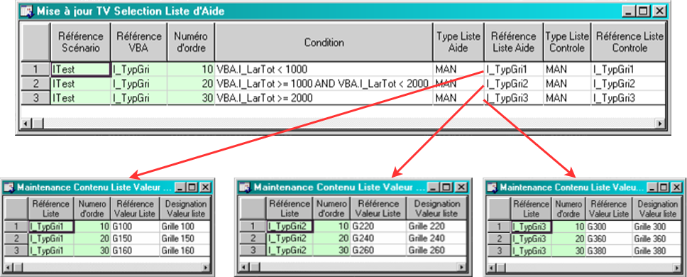 Dans ce cas, l’utilisateur pourra utiliser plusieurs listes d’aides de type MAN, DYN, RCT, Mat ou ARC. Pour chaque liste, une condition lui sera associée. Si cette condition est vérifiée, la liste de valeurs rattachée sera affichée lors de l’appel de l’aide.