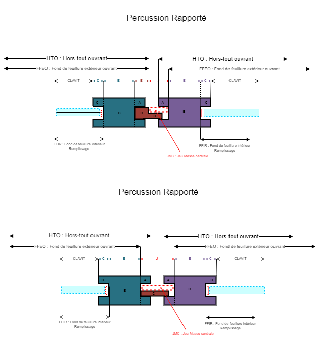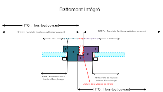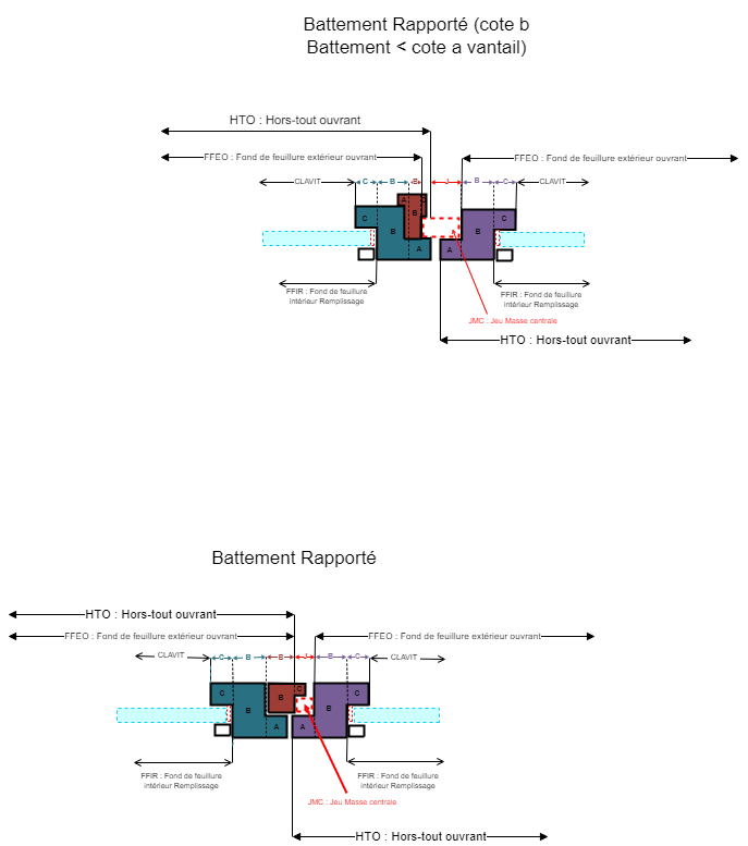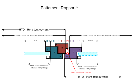Le jeu entre les deux vantaux de la masse centrale ( avec ou sans battement rapporté) est toujours défini entre les cotes b des 2 profils vantaux, ou entre la cote b du profil du vantail principal et la cote b du battement rapporté.