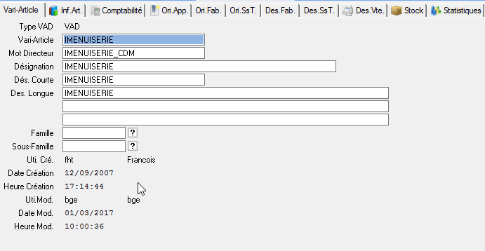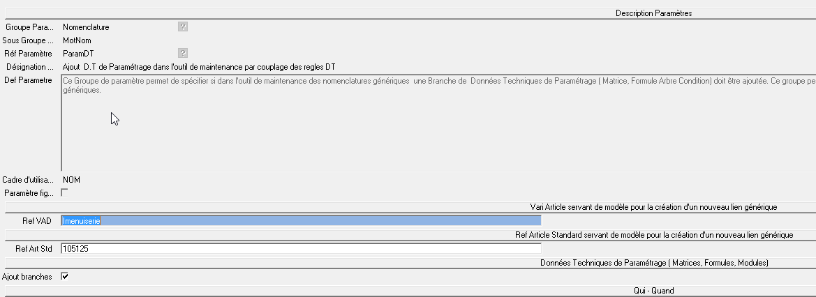 L’article ou le vari article initialisé par défaut correspond au paramètre défini sur le groupe de paramètre Nomenclature / MotNom / ParamDT.