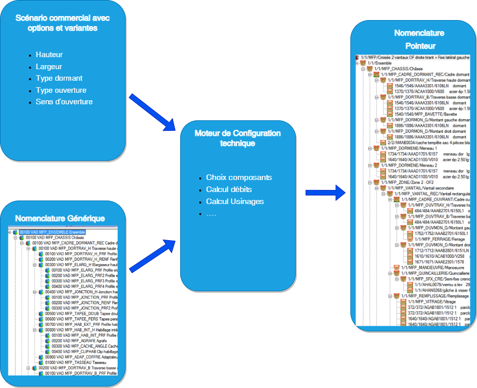 Le principe du moteur de configuration technique est d’interpréter les règles de gestion définies par le bureau d’étude et associées à une nomenclature générique, de calculer à partir de ces règles les valeurs spécifiques liées la configuration en cours (scénario commercial) afin de générer une nomenclature de pointeur.