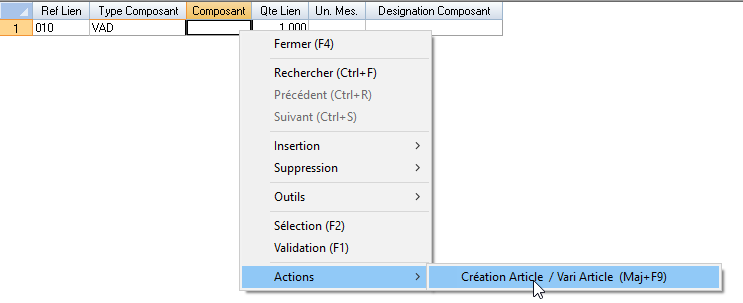 Composant : référence du vari article ou article standard suivant le type article sélectionné. L’action Création Article / vari Article permet d’accéder directement en duplication (à partir d’un modèle défaut) sur la fiche de saisie Article ou vari Article
