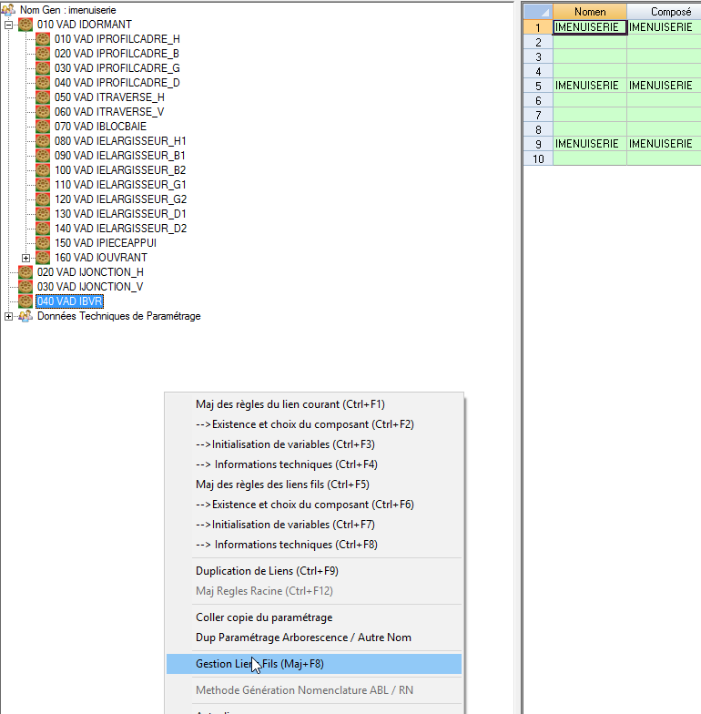 L’action Gestion Liens Fils permet de créer modifier et supprimer les différents liens d’un composé :