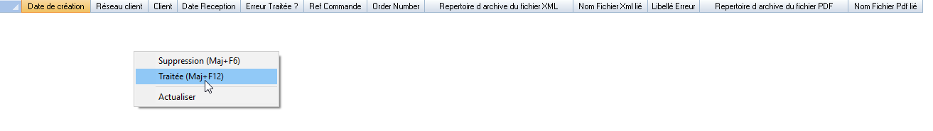 Cette liste permet de consulter et gérer les différents traitements tombés en erreur. L’action traitée permet de flaquer le fait que l’erreur a été traitée. L’action suppression permet de faire disparaitre l’enregistrement de la liste.