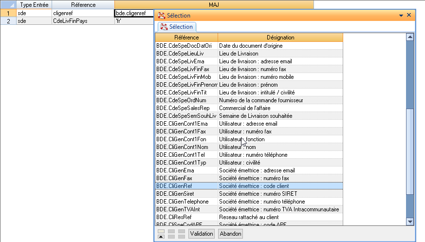 Les BDE disponibles sont accessibles depuis les listes d’aide des outils de paramétrage.