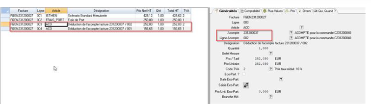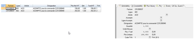 Chaque ligne ajoutée dans la facture doit faire référence à une n° facture/ligne acompte, le taux de TVA de la ligne liée et un montant qui ne peut exéder le montant de la ligne de la facture d’acompte.