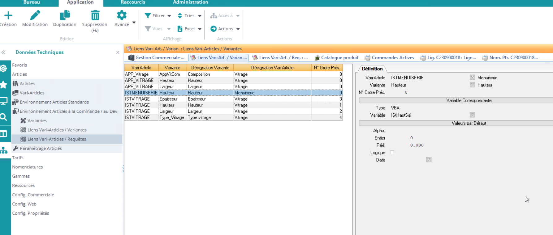 Les variantes des vari-articles peuvent être initialisés dans la requête RV1 définie dans le lien vari-article requête. Mais il est également possible d’initialiser directement les variantes depuis le vari-article dans l’applicatif ci-dessous: