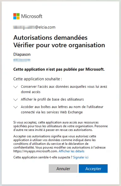 Ensuite Diapason va demander un jeton d’accès à AzureAD (un utilisateur de l’Active Directory donnera ponctuellement l’autorisation).