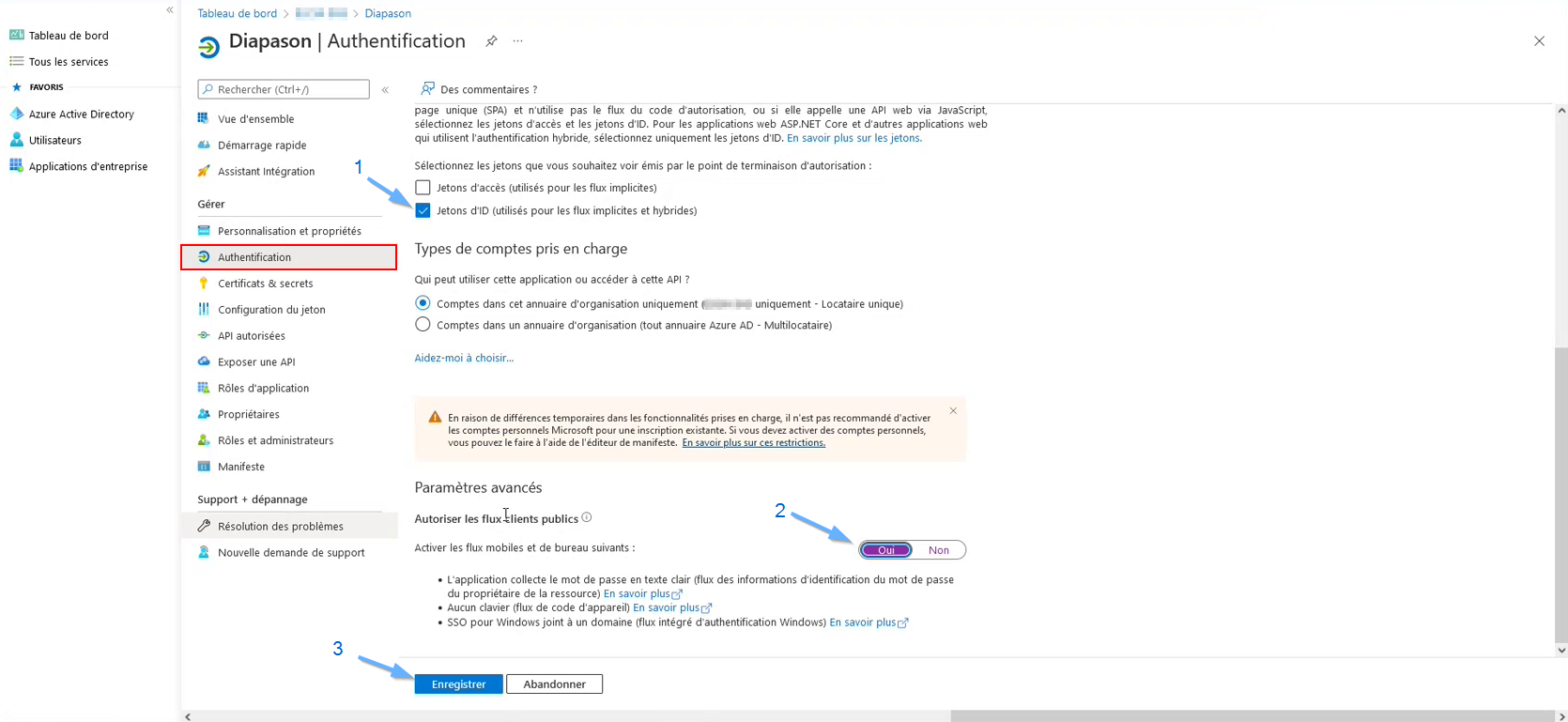 Cocher « Jetons d’ID (utilisés pour les flux implicites et hybrides)