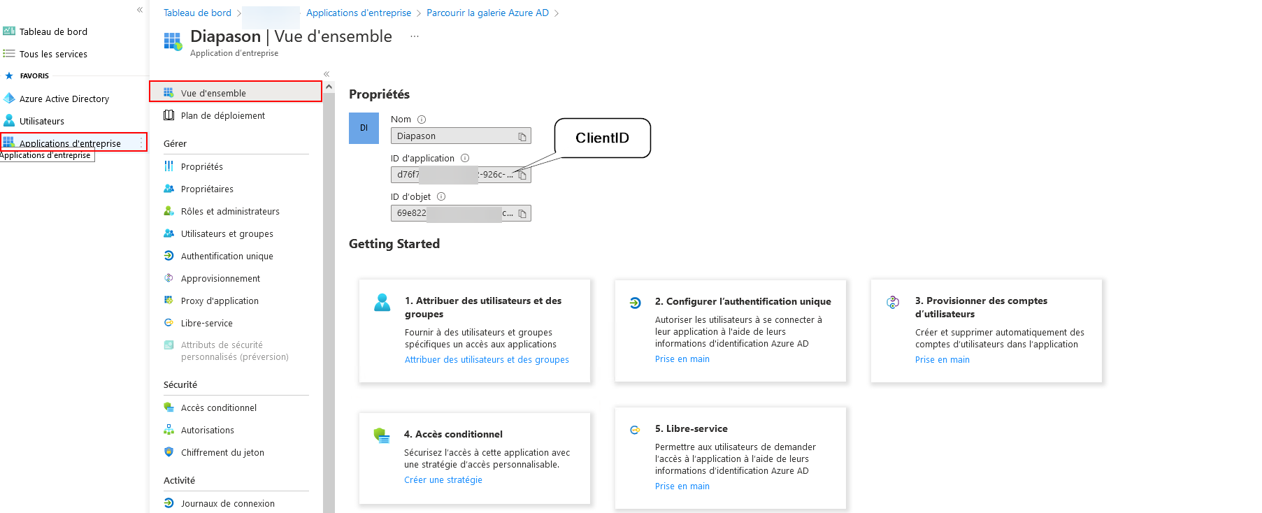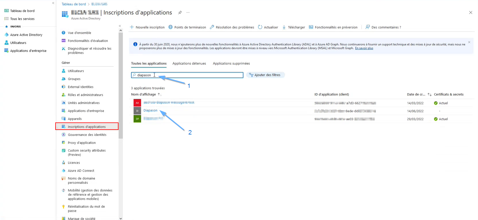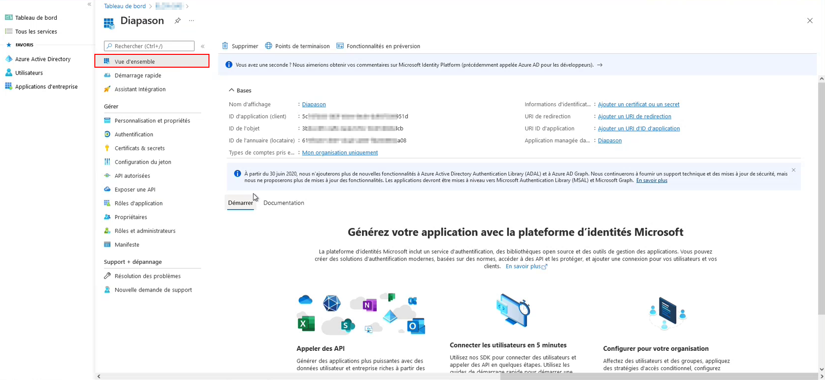 Après avoir créé l’application Azure AD, on pourra utiliser le TenantID et le ClientID pour demander un jeton d’accès depuis un logiciel/application client (Ex : Diapason).