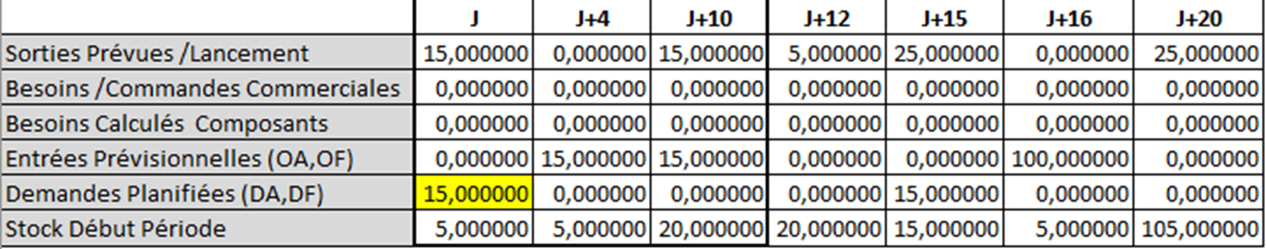 Le calcul de besoins nets positionne une demande d’approvisionnement au jour J pour éviter la rupture.