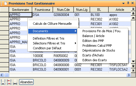 Cette action permet de lancer le document « ISJouProFM » (type « REB/Tableur » =>Type 7) qui permet d’éditer le journal des provisions de Fin de Mois / Fournisseur.