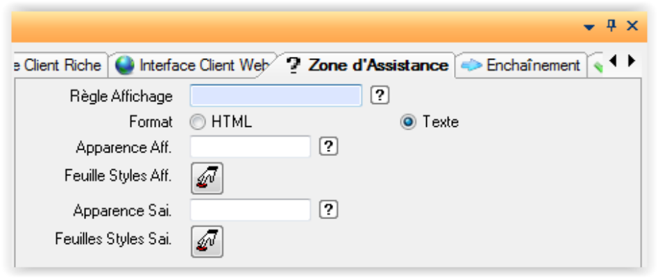 Les informations suivantes de l’onglet ne s’appliquent qu’aux scénarios d’aide de type « Assistant ».