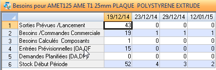 Le tableur présente par jour les résultats du calcul de planification générale. Le format d’affichage des quantités peut être paramétré en utilisant le paramètre général « PLA-BES-NUM »