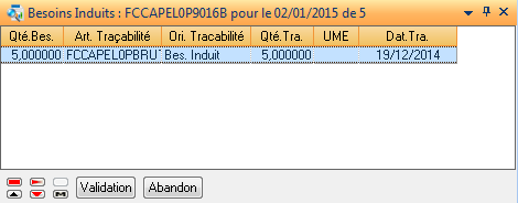En étant positionné sur la ligne Bes.Ext. ou sur la ligne Bes.Cal., la fonction Besoins Induits affiche, à la place de la fenêtre détail la liste des composants (par rapport à la nomenclature de gestion et non à celle de définition) induits par le besoin en cours. La validation d’un de ces composants permet d’accéder à la consultation de ses besoins.