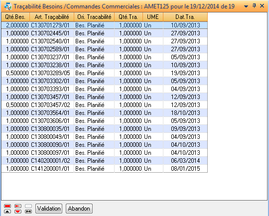 Dès lors, en étant positionné sur la ligne Demandes Planifiées(DA,DF), la fonction Traçabilité affiche à la place de la fenêtre détail la liste des composés qui sont à l’origine du besoin planifié. La sélection d’un de ces composés permet d’accéder à la consultation de ses besoins.