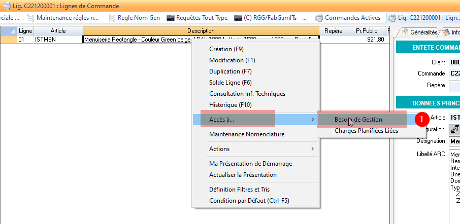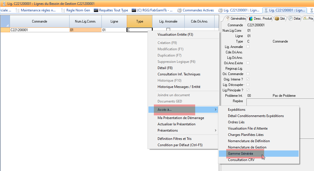 Puis depuis les lignes de besoin de gestion, vous pouvez accéder à la gamme générée: