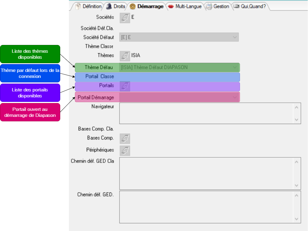 Portail Classe : Portail défini sur la classe principale. Zone non saisissable. Pris en compte uniquement si le portail défini pour l'utilisateur n'est pas renseigné