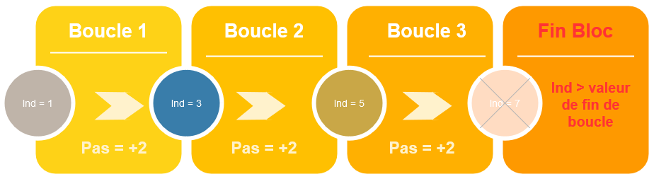 Sur cet exemple, le pas (c’est-à-dire la valeur qui sera incrémentée à chaque passage de boucle) n’est pas précisé, il sera automatiquement affecté à ‘1’.