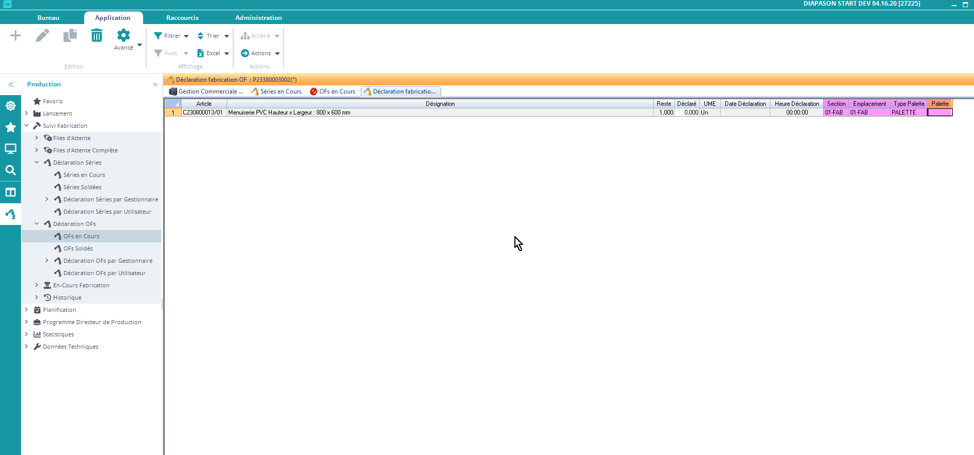 Déclaration de Fabrication. Saisie manuelle de la quantité et des informations nécessaires au mouvement de stock (palette, emplacement, etc.)