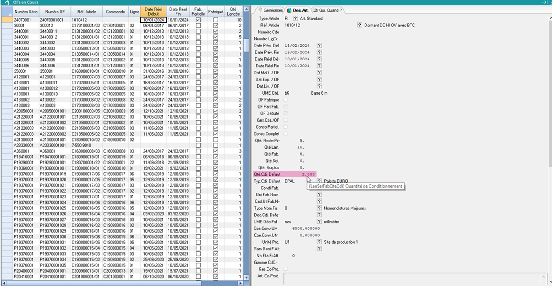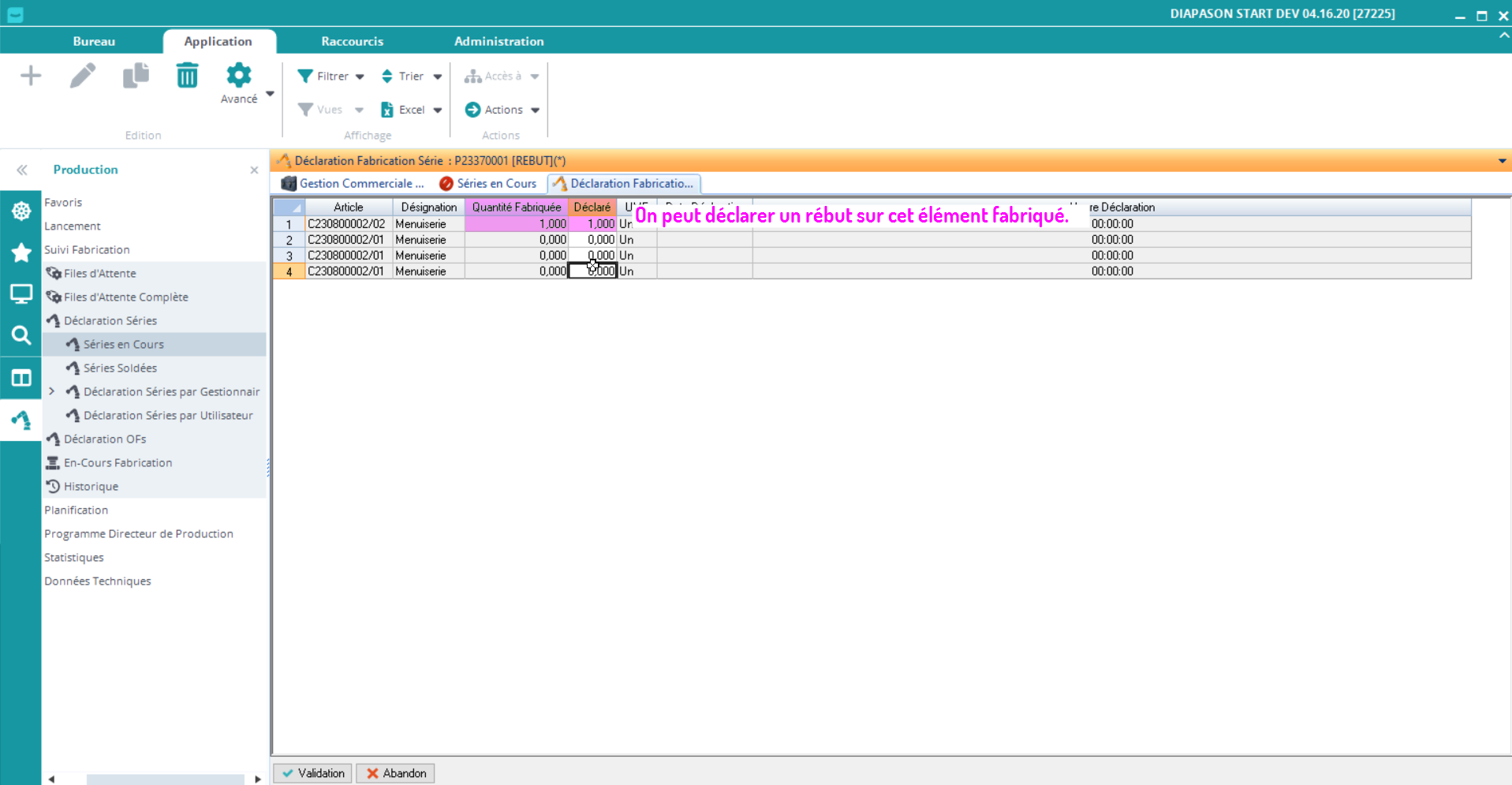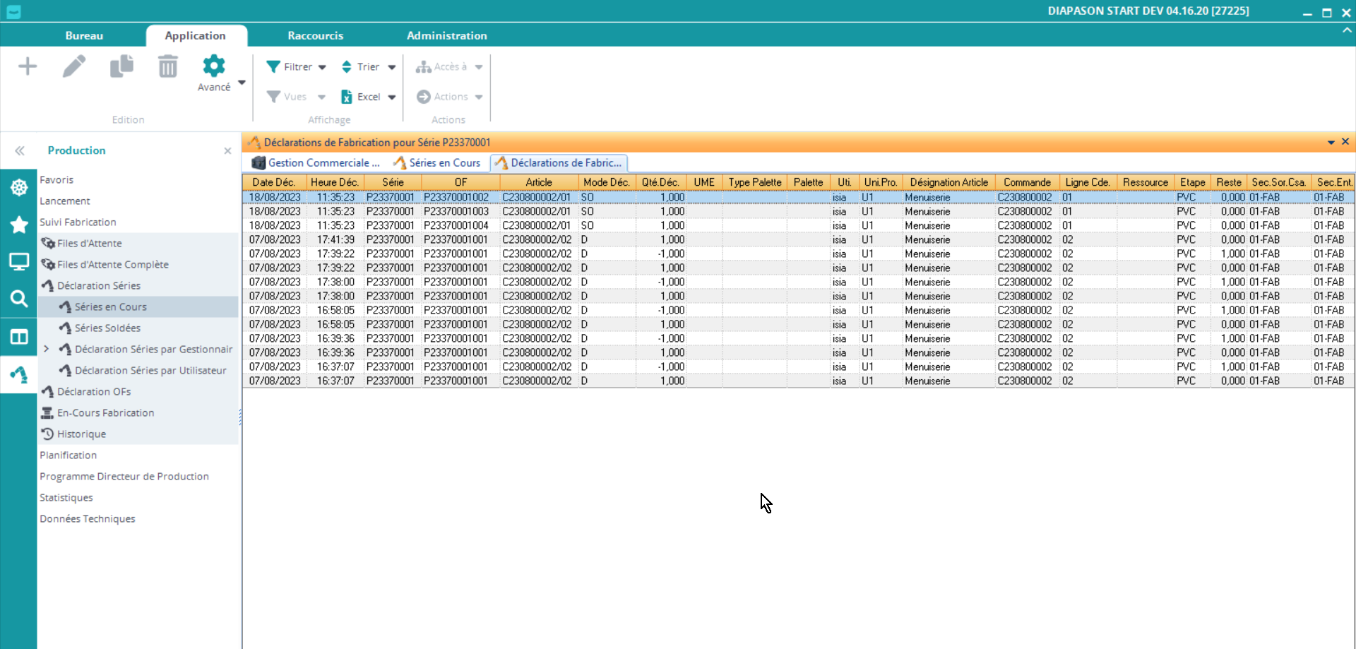 La déclaration de la fin de fabrication de la série entraine la déclaration des dernières étapes de tous les OFs de la série. Les autres étapes de la gamme de suivi file d’attente ne sont pas déclarées automatiquement.