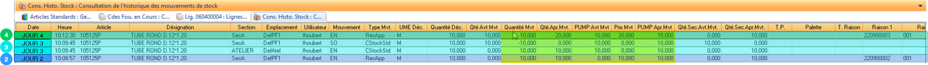 Le PUMP renvoyé est le dernier PUMP stock connu de l’article différent de 0