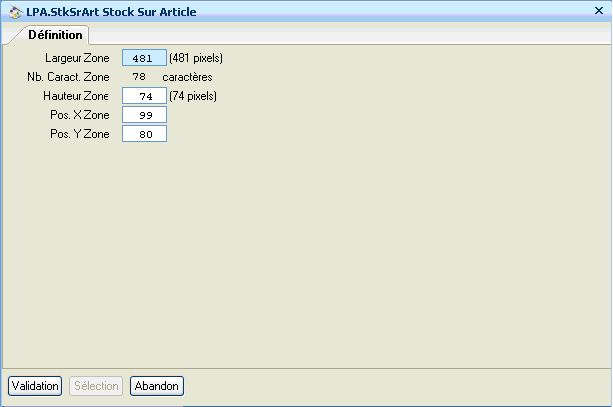 Pos. X Zone : Position en abscisse de la zone à partir du bord gauche du formulaire (en pixels). Cette position ne peut pas être inférieure à 30.