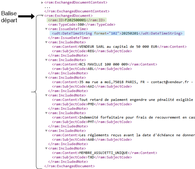 -pour cette correspondance, balise de départ -> <rsm:ExchangedDocument>