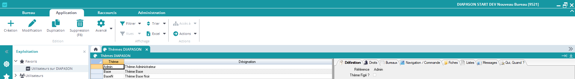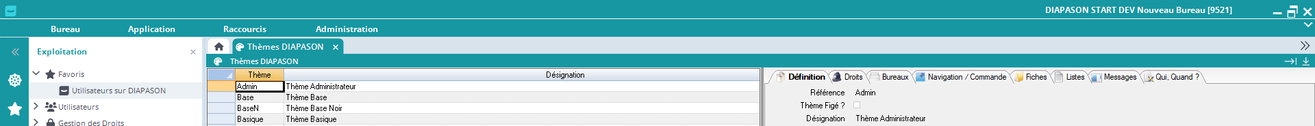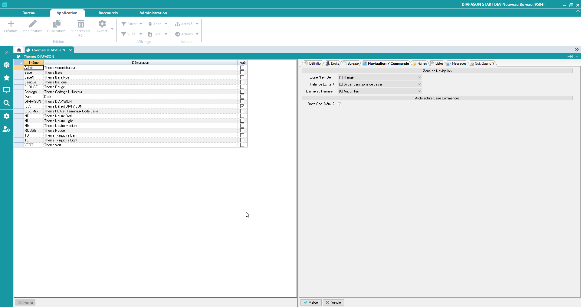 Thème Figé: Indique si coché que le thème est figé. Dans ce cas, il ne peut être ni modifié, ni supprimé. Le thème « ISIA » est figé (thème par défaut correspondant aux versions antérieures de DIAPASON, avec le ruban de navigation en plus).