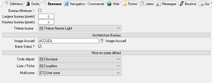 Liste/Fiche: Définit le mode couplage des applications à l’ouverture du bureau. Ce mode ne concerne pas les applications de type GFD où le mode de couplage est précisé par présentation.