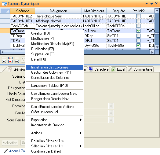 Initialisation des Colonnes sur tableurs dynamiques. Cette action a pour but d’initialiser la définition des colonnes à partir de la liste paramétrée sur les tableurs dynamiques pré initialisés. Cette action est intitulée « Initialisation des colonnes ».