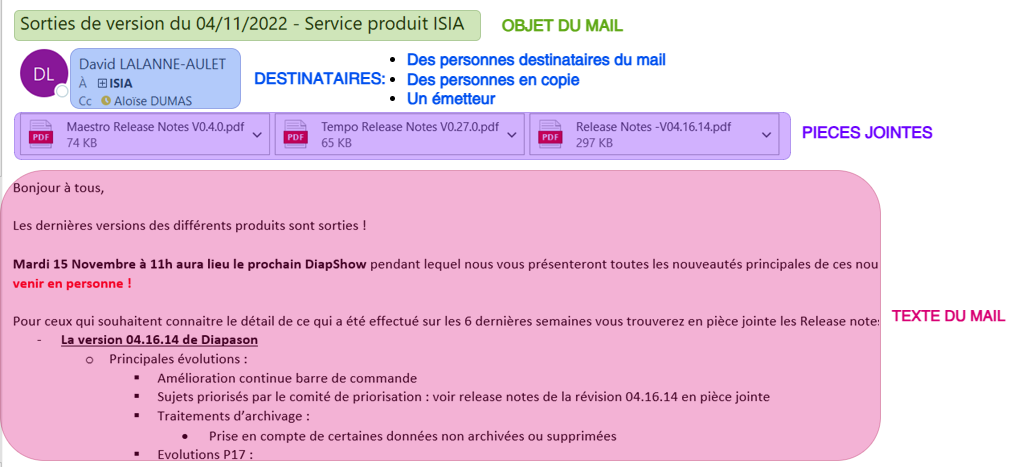 Exemple: Pour envoyer un mail à Benoît avec François en copie et Fanny en émettrice: Destinataire = “D=bmorandet@elcia.com;C=fhoubert@elcia.com;R=ftastet@elcia.com” |