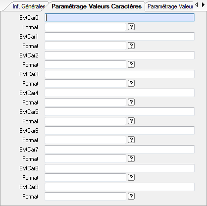 Pour chaque caractéristique d’un événement il faut définir le moyen de lire l’information dans le fichier (en fonction du type de lecture choisi sur le premier onglet) :