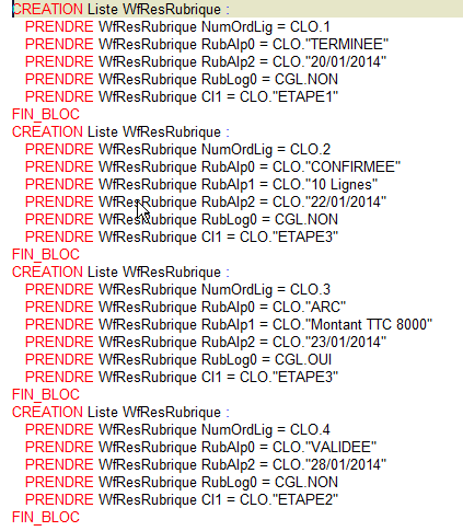 ![]() | Dans la requête, on doit impérativement alimenter la liste WFResRubrique qui contiendra les données du flux, avec pour chaque étape du flux :