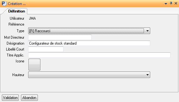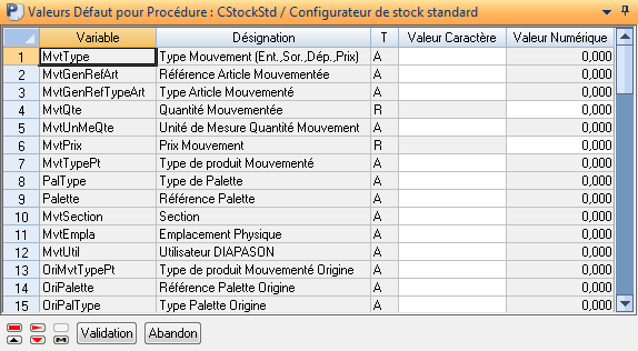 Mais DIAPASON peut également le calculer, en initialisant la variable palette gérée suivant le type de mouvement (Palette pour une entrée ou DesPalette pour un transfert de produit sur une nouvelle palette) avec la valeur *NOUVELLE. Dans ce cas, DIAPASON génère un numéro de palette et celui-ci est accessible dans la variable palette gérée suivant le type de mouvement dans la requête de validation enchaînée après la validation : ceci permet de lancer une édition d’étiquette à ce stade.