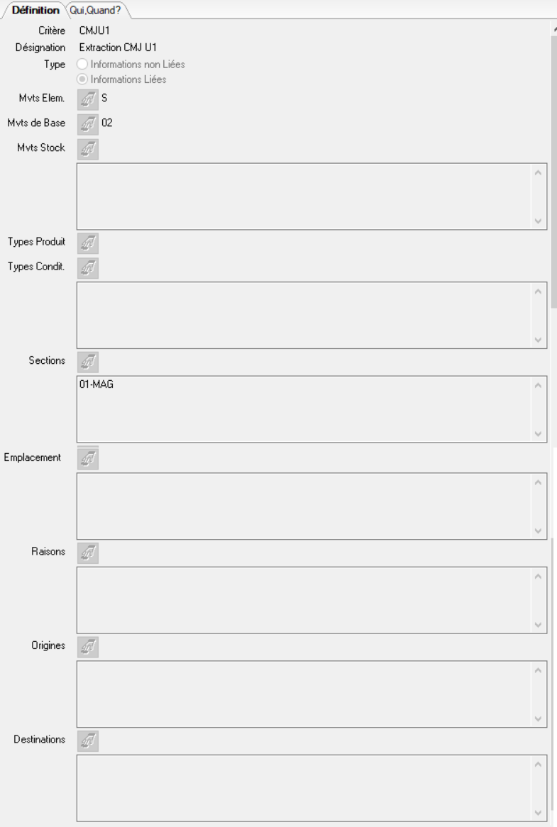 Si « Informations liées » est cochée : on fera apparaitre dans les historiques de stocks les mouvements répondant à toutes les conditions définies dans les zones ci-après ( condition 1 ET condition 2 ET condition 3 ET…),