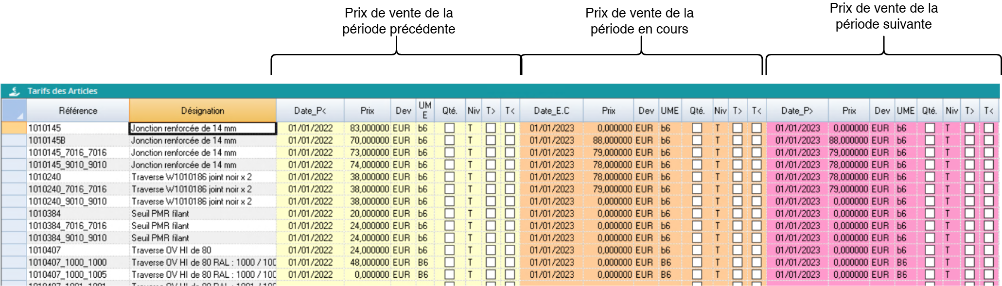 Accès par tableur au détail par quantité et par date des variations de tarification à partir de la date initialement saisie pour les articles préalablement sélectionnés. La gestion du tableur est identique à celui de la fonction Sélection Critère.