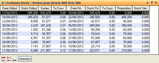 Présentation d’une liste donnant l’évolution du stock pour l’article courant sur toutes les périodes du calcul.