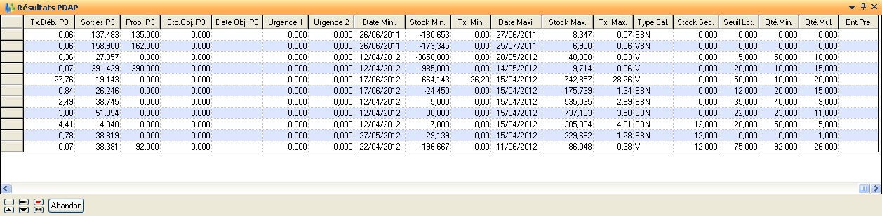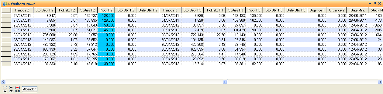 Les résultats sont présentés pour les trois prochaines périodes non figées, les articles étant triés par classe de périodicité et classe PDAP :