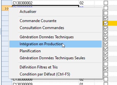 Puis, dans la liste des commandes qui s’affichent, sélectionner là ou les commandes à intégrer, et clic. Droit “Intégration en Production”:
