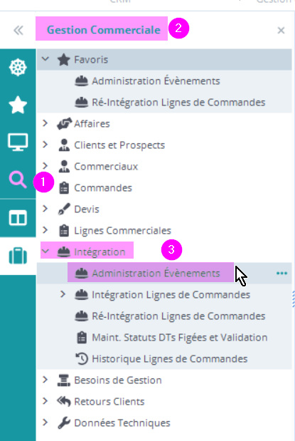 Dans l’explorateur, aller dans Gestion Commerciale>Intégration>Administration Evènements