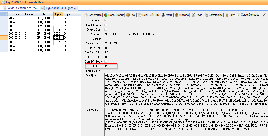 Il est possible d’activer les données techniques sur une ligne de devis en alimentant le champ « Act. Int. ?».(SDL.CdeLigInCGen).