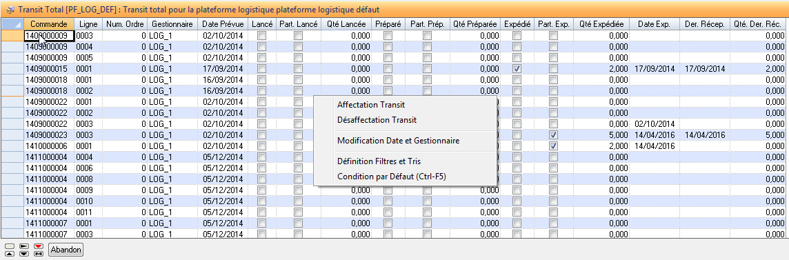 Désaffectation Transit: Permet, après message de confirmation, de désaffecter de la plateforme logistique les lignes de besoins de gestion sélectionnées dans la liste.