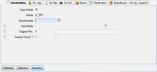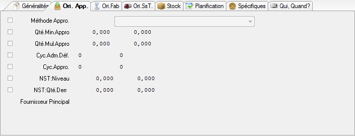 L’accès en saisie sur cet onglet n’est possible que si l’article est d’origine principale ‘A’ (Approvisionné) ou si le champ « Approvisionné ? » est coché sur l’article.