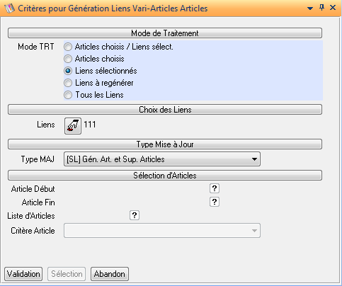 Génération Liens / Critères : Lance le traitement DTD-VA&AR sur le Lien courant, mais il est possible de changer tous les critères de génération. Par défaut, ils sont initialisés avec les caractéristiques du Lien courant.
