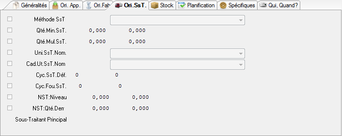 L’accès en saisie sur cet onglet n’est possible que si l’article est d’origine principale ‘S’ (Sous-traité) ou si le champ « Sous-Traité ? » est coché sur l’article.